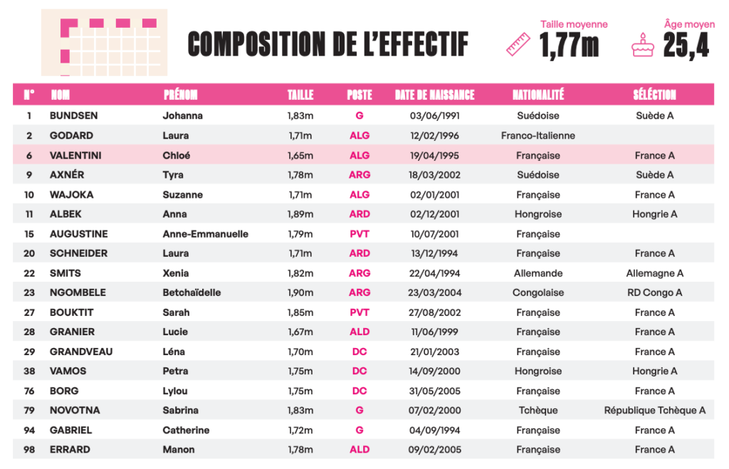 Ă€ noter en revanche le retour de ChloĂ© Bellonnet au poste d’ailière gauche, ainsi que celui de Romane Gindro, appelĂ©e Ă  supplĂ©er Florence Bonnet au poste de gardienne de but.